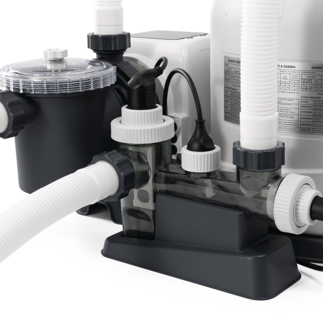 Δύο συστήματα σε ένα προϊόν: αυτή η αντλία φίλτρου άμμου Krystal Clear® διαθέτει ενσωματωμένο σύστημα αλμυρού νερού - εκτός από αποτελεσματική, είναι επίσης βολική: η αντλία φίλτρου άμμου, με ροή 8000 L/h, επιτρέπει εξαιρετική διήθηση. Από την άλλη πλευρά, το σύστημα αλμυρού νερού παράγει χλώριο (ποσότητα: 11 g/h) από το διαλυμένο αλάτι στο νερό, εξαλείφοντας τα φύκια και τα βακτήρια. Το νερό θα είναι καθαρό, απολυμασμένο και πεντακάθαρο, εξασφαλίζοντας ασφάλεια για τους κολυμβητές. Με τον ενσωματωμένο 24ωρο αυτόματο χρονοδιακόπτη, μπορείτε εύκολα να ρυθμίσετε τον χρόνο λειτουργίας.