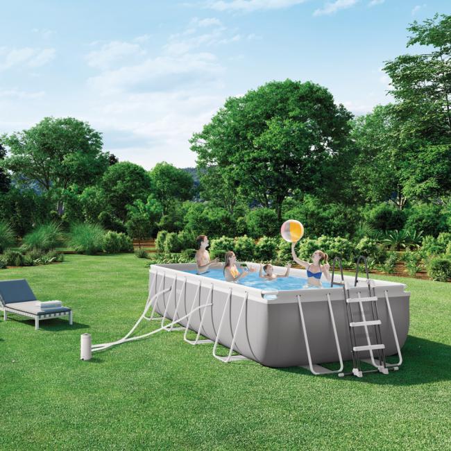 The Prism Frame™ Rectangular pool is designed to fit any backyard. The pools are built to provide extra swimming space and will hold more pool water than the traditional Round Frame pools, allowing swimmers to appreciate the maximized swimming area! With a sophisticated look, Intex Prism Frame™ pools will provide families with endless fun with a taste of luxury at an affordable price.