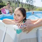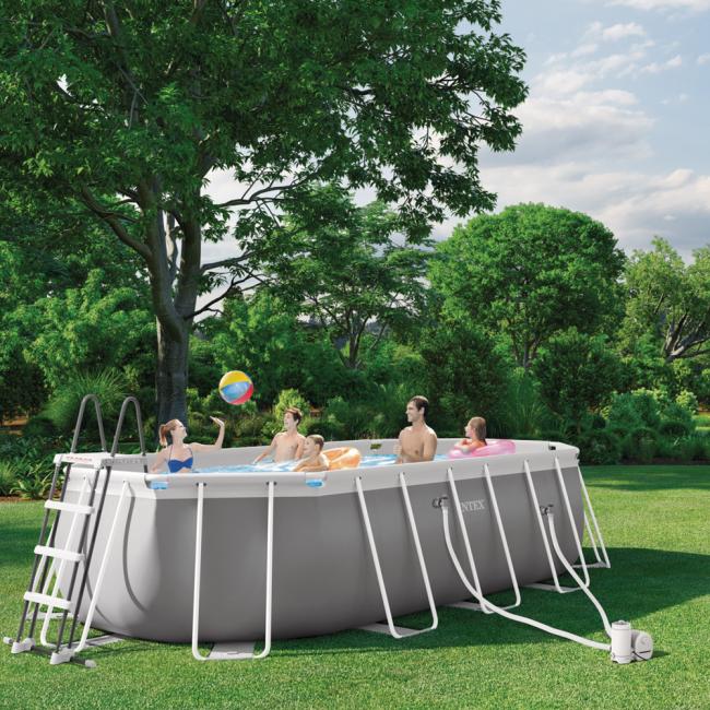 Intex Oval Frame Pools combine the best of both the Easy Set and Metal Frame pools. The inflated top ring makes the setting-up a breeze, while the powder coated metal frames offer strength and durability, providing additional support to extend the rectangular shape and maximize the swimming area. The frame is rust-resistant and assembled with Snap-On joints.
