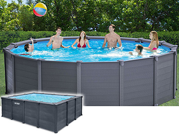 Intex® offers a full range of above ground pools for every budget, backyard size and landscape. There is a range of pool styles: Easy Set™ , Prism Metal Round , Metal Frame Round, Oval Frame, Small Rectangular, Prism Rectangular, Ultra Frame Round, Ultra Frame Rectangular , Woodgrain Graphite. Each is made with Super-Tough™, triple-ply sidewalls, providing strength, proper shape, and resistance to puncture. The result is a pool that can provide many summers of enjoyment!